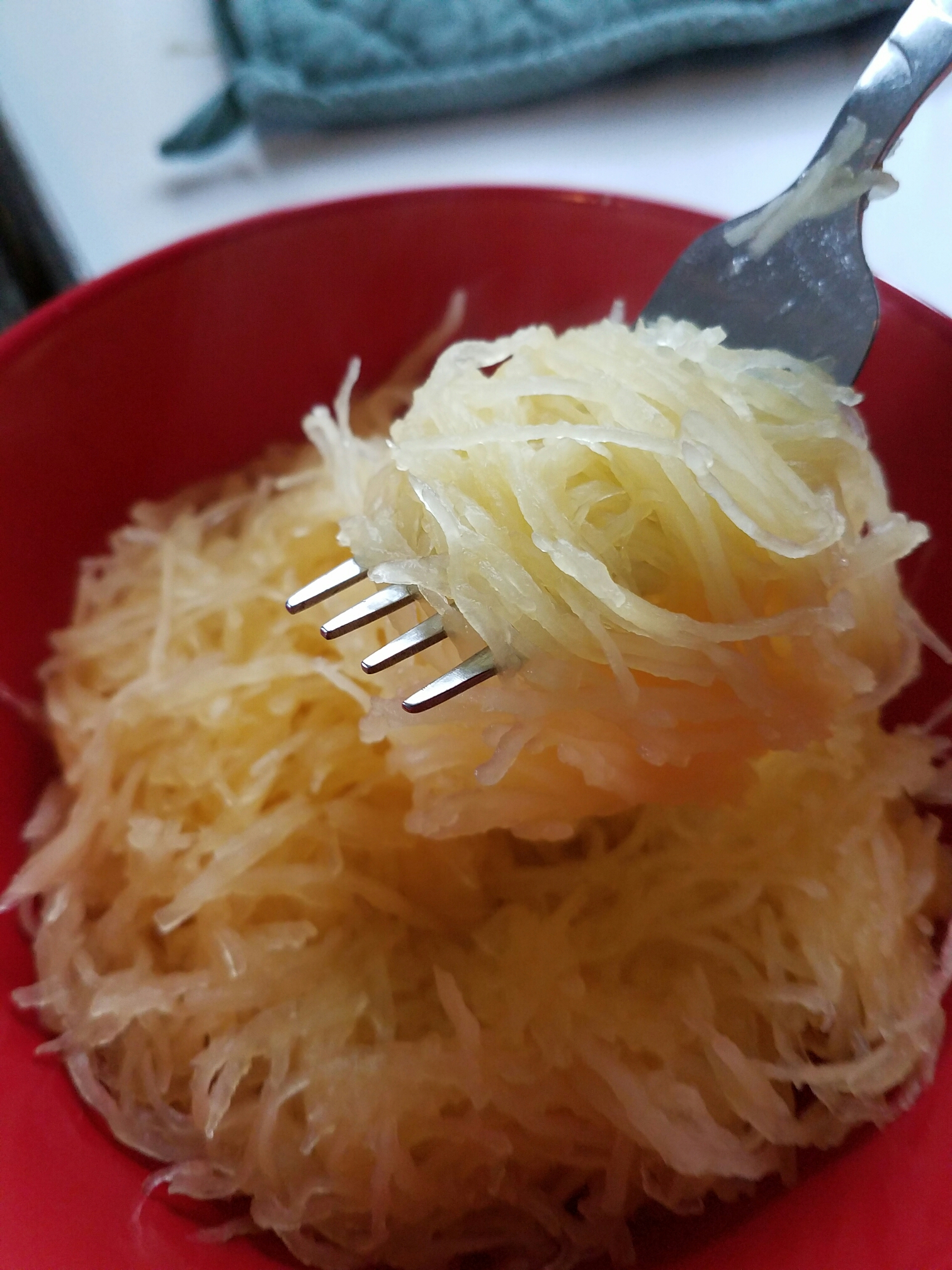 3. Place a tiny bit of water in a cookie sheet or casserole dish. Cook spaghetti squash cut side down for 30 minutes