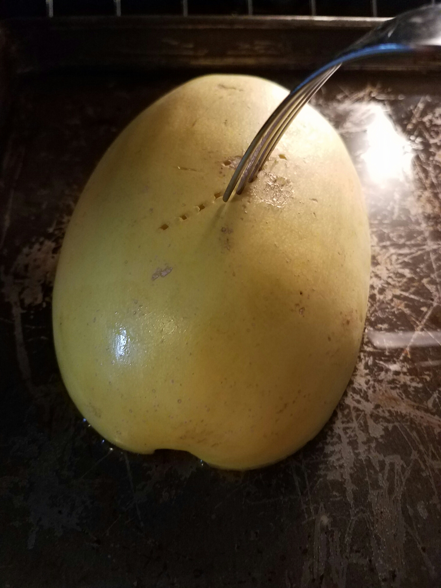 6. Keep checking spaghetti squash. Take it out of the oven when a fork easily pokes through the rind.
