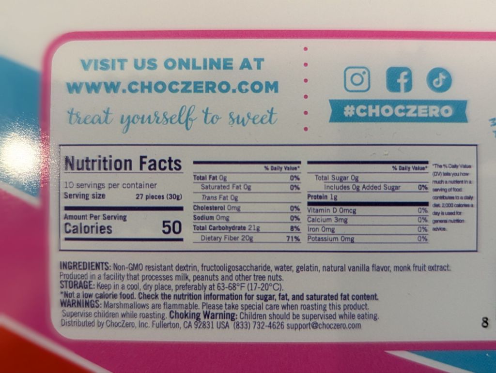 This box of mini marshmallows made by ChocZero has a net weight of 10.5 oz. For the fact that it is zero sugar, it is surprisingly very tasty and not too sweet. However I only made the review four stars, because it is not as bouncy as a normal marshmallow would be.They are also not very small. More like medium sized.